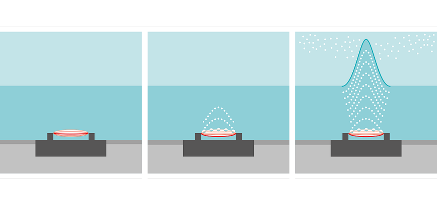 振荡器振幅的变化会产生强大的水锤,释放微小的空化气泡。表面上气泡的内爆将微小的水气溶胶喷射到周围空气中。